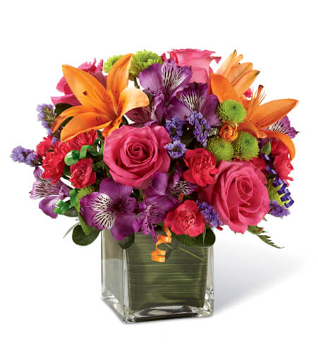 This bouquet represents joy, brightness, and celebration. It includes a mix of delightful colors such as fuchsia roses, vivid orange Asiatic lilies, royal purple Peruvian lilies, hot pink mini carnations, lavender statices, and green poms, all arranged on a bed of lush greens. Each flower holds a unique meaning, from appreciation and gratitude to passion and friendship.