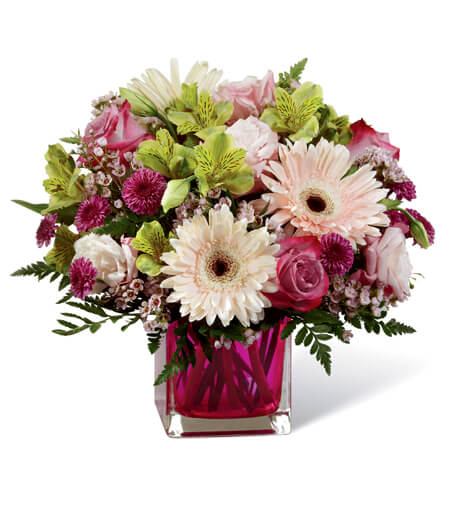 If you want to send this lovely bouquet to new parents, you can take advantage of same-day delivery. The raspberry glass cubed vase adds an extra touch of sophistication to the arrangement. Local florists will ensure that the bouquet is delivered fresh and on time.